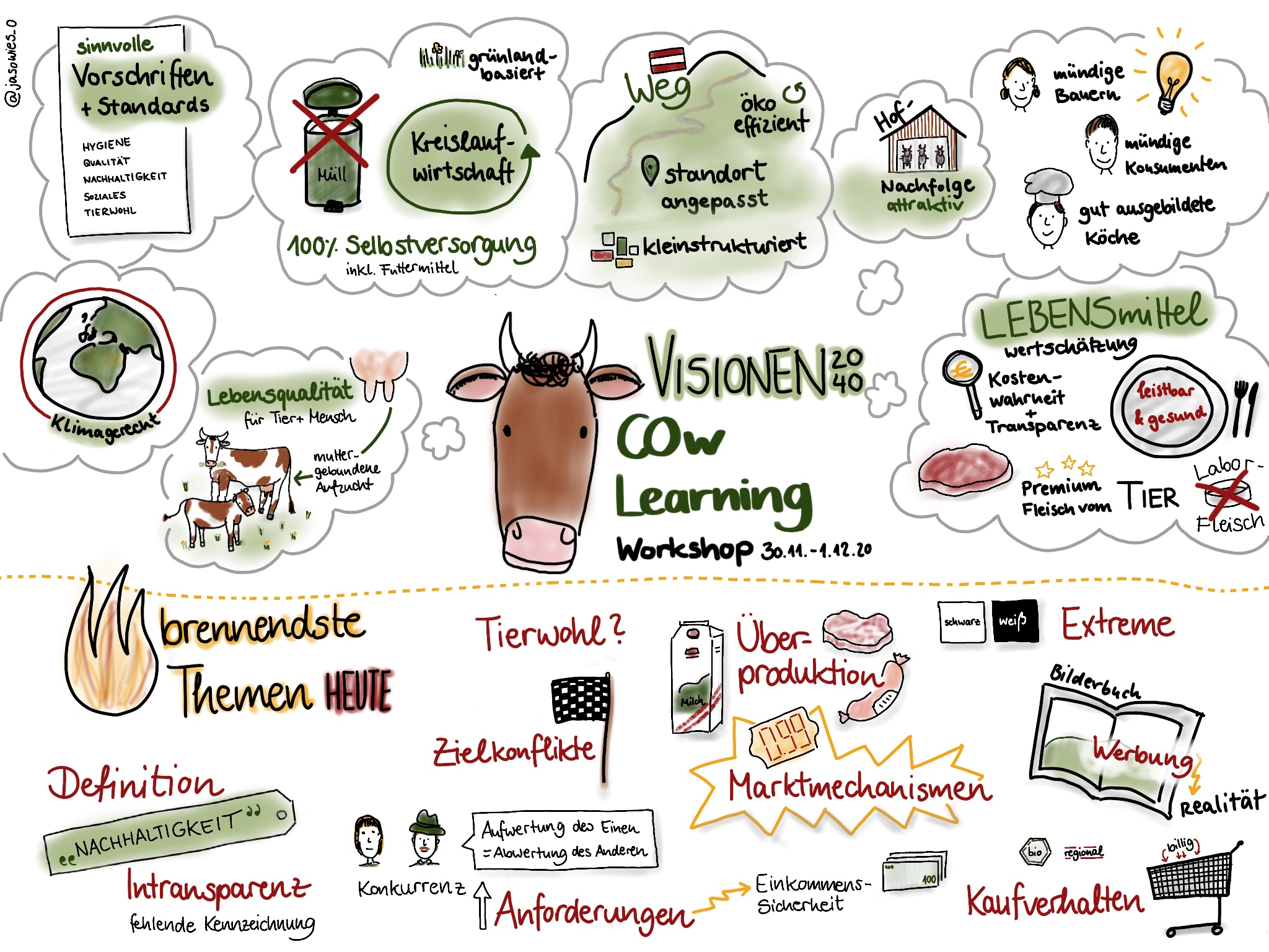 Beim ersten Projektworkshop im Herbst 2020 wurde von den Teilnehmer:innen ein gemeinsames wünschenswertes Bild entwickelt. Hier exemplarisch noch ein paar Stichworte dazu: Konsument bekommt wieder Bezug zum Tier – das…
